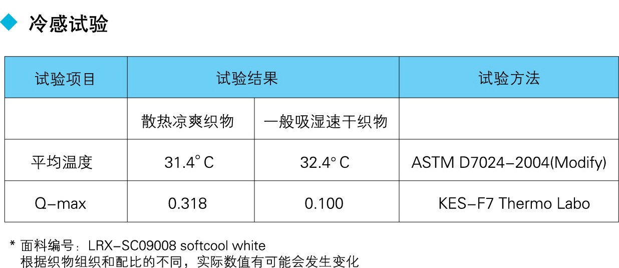 用冰涼纖維加工成(chéng)的面(miàn)料不僅可以達到瞬間接觸涼感,而且具有吸汗透汗效果,使人穿着有一種(zhǒng)涼爽的感覺,在炎熱的夏季給人清涼舒爽,舒适惬意的感覺。